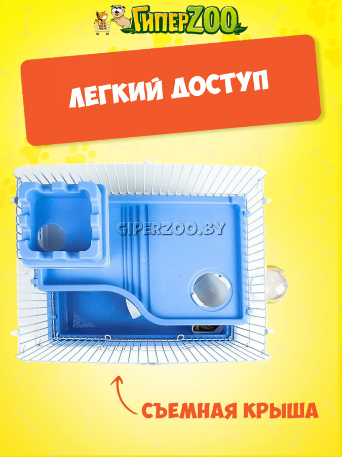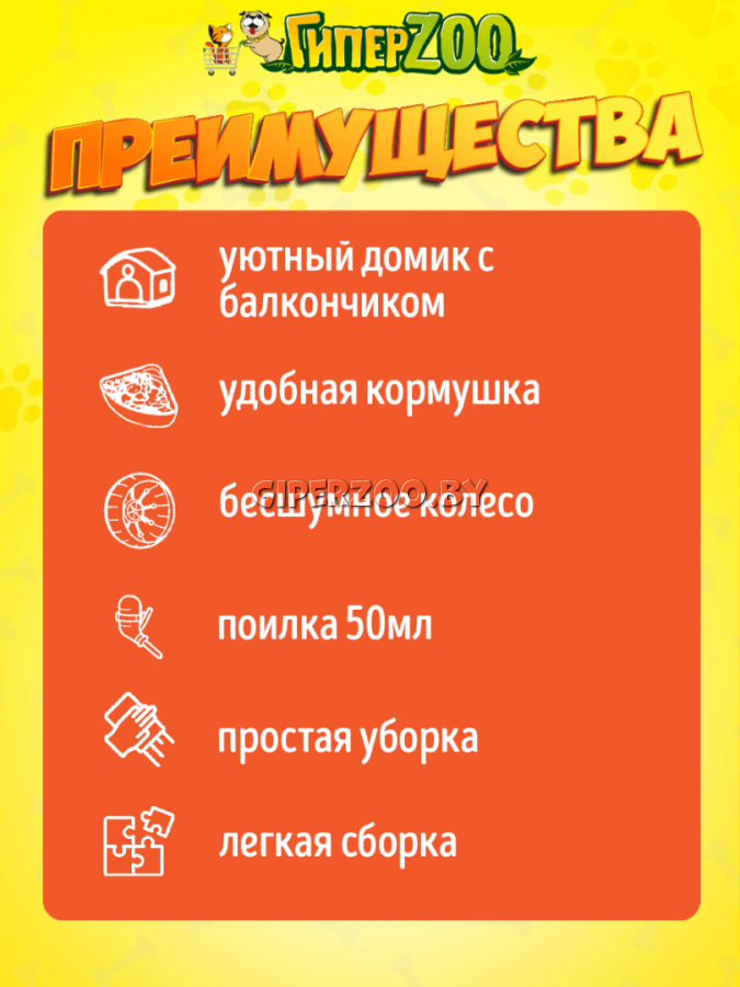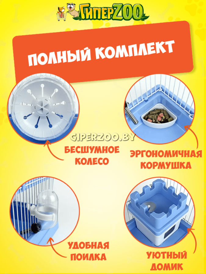 В комплект входят домик, внешняя поилка, закрытое беговое кольцо для поддержания физической активности, кормушка и удобная ручка для транспортировки.