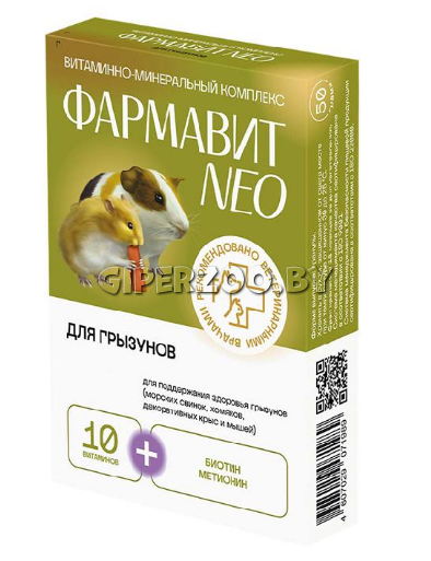Фармавит Neo – комплекс витаминов, аминокислот и минералов, подобранных с учетом физиологических особенностей грызунов (морских свинок, хомяков, мышей и крыс).