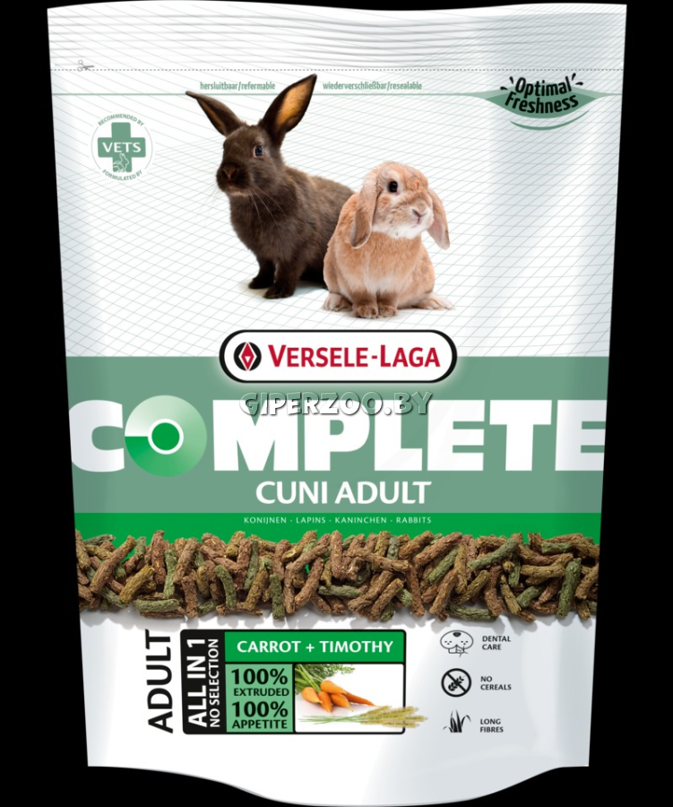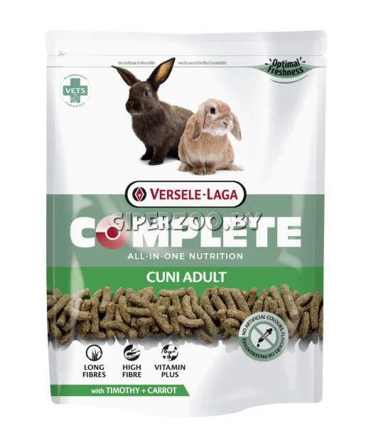 Карликовые кролики это травоядные животные от природы, которым необходимо питание с достаточным количеством клетчатки и низким содержанием крахмала. Cuni Complete содержит 20 % грубых волокон. Новый, уникальный производственный процесс позволяет включать в корма серии Complete цельные, длинные, волокна, богатые силикатом. Эти волокна обычно есть в природном корме. Эти длинные волокна поддерживают и улучшают функцию пищеварения и роста зубов намного лучше, чем традиционные корма для грызунов, содержащие перемолотые волокна.