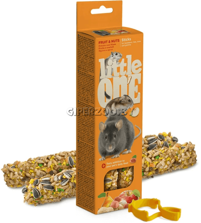 Лакомство для хомяков, крыс, мышей и песчанок LITTLE ONE Палочки с фруктами и орехами 2х60 г – дополнительное питание для декоративных животных. Пищевая ценность: белки - 12%, жиры - 5%, клетчатка – 4,8%, зола - 2,6%, кальций - 0,22%, фосфор - 0,3%.