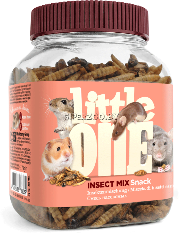Смесь насекомых является вкусным и питательным дополнительным кормом для всеядных грызунов, а также ценным источником важных макро- и микронутриентов. Ее состав идеально сбалансирован и включает в себя сушеные куколки тутового шелкопряда, личинки мухи чёрной львинки, мучных червей и сверчков.