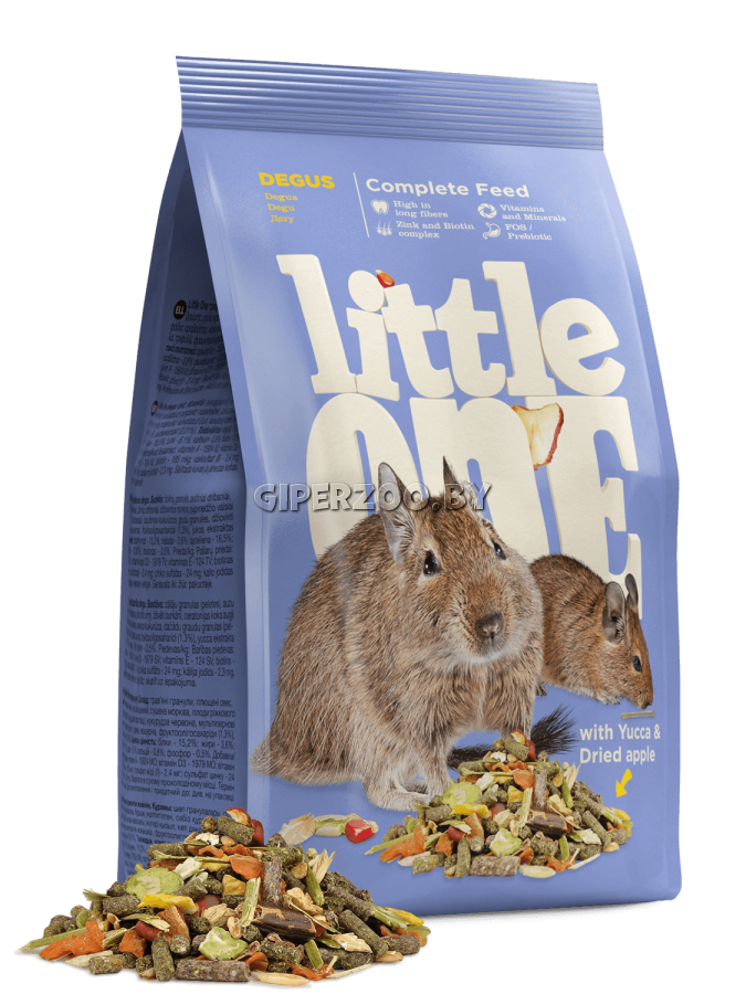 Полноценный корм с добавлением витаминов и минеральных веществ, сбалансированный в соответствии с пищевыми потребностями дегу. Рацион отличается высоким содержанием клетчатки, необходимой для правильного пищеварения дегу.