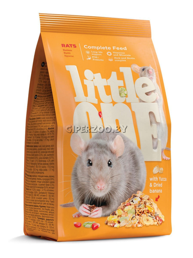 Рекомендации по применению: Суточная доза корма Little One для крыс составляет 20 - 30 г на зверька в зависимости от его размера. Кормите Вашего питомца два раза в день в одно и то же время. Следите, чтобы у зверька всегда была свежая вода. Помните, что любые зерновые корма следует сочетать со свежими продуктами. Крысам необходима свежая зелень, фрукты и овощи. Крысам периодически необходимо давать корма животного происхождения. Это могут быть кусочки вареной курицы, творог или молоко. Состав: Воздушная пшеница; Пшеница, Овсянка; Экструдированная соя; Кукуруза; Кукурузные хлопья; Горох плющеный; Овес; Гречиха; Ячмень; Хлопья люпина; Воздушная кукуруза; Экструдированная кукуруза; Плоды рожкового дерева (кароб); Подсолнечник; Сушеный банан; Фруктоолигосахариды; Витамины и минеральные вещества.