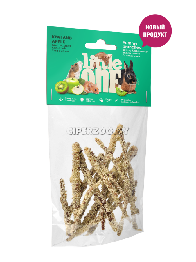Little One Лакомые ветви с киви и яблоком - это лакомство для всех видов грызунов. Ветви в обсыпке из киви и яблока станут излюбленным лакомством для грызунов и кроликов, а также полезным дополнением к ежедневному рациону. Стачивая зубы, питомец будет получать ценные витамины и минеральные вещества, содержащиеся в ветвях и фруктах. Киви является ценным источником клетчатки, витамина С, пектина и магния, которые оказывают благотворное влияние на пищеварение, работу сердечной мышцы и состояние иммунитета. Яблоко, благодаря высокому содержанию витаминов, железа и пектина, оказывает положительное влияние на иммунитет, состояние сосудов, крови и помогает выведению из организма токсинов и шлаков.