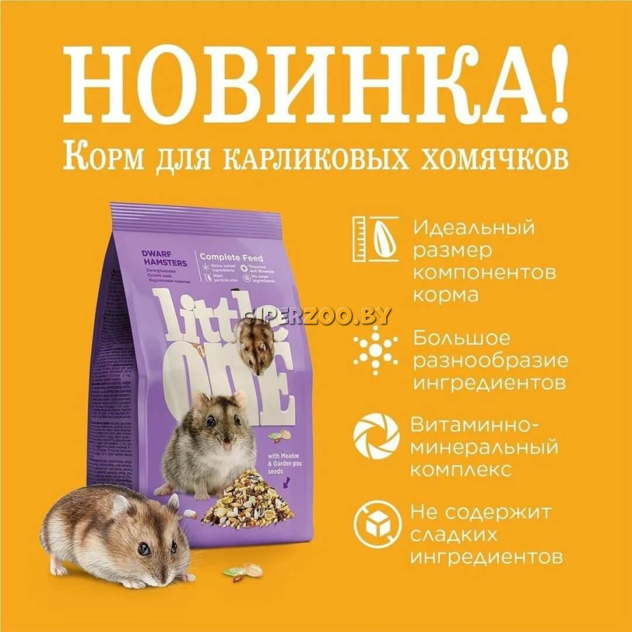 Полноценный корм с добавлением витаминов и минеральных веществ. Разнообразный состав, включающий зерна, семена, орехи и редкие плоды. Рацион прекрасно подходит как для хомяков стандартного размера, так и для карликовых видов.
