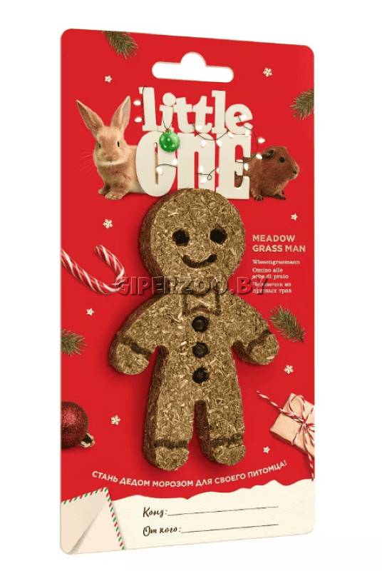 Little One Лакомство-игрушка человечек из луговых трав для морских свинок, кроликов и шиншилл, 65 гр – это оригинальный подарок для вашего травоядного питомца. Весёлый человечек, полностью съедобный и изготовленный из ароматных луговых трав с добавлением полезных ягод, не только разнообразит рацион, но и поможет ухаживать за зубами вашего кролика, морской свинки или шиншиллы. Хрустящая текстура игрушки надолго увлечёт питомца, а яркая упаковка в формате открытки станет отличным праздничным атрибутом.