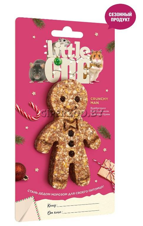 Little One Новогоднее лакомство-игрушка человечек пряня для хомяков, крыс, мышей и песчанок, 45 гр – это оригинальный и вкусный подарок для вашего всеядного питомца. Лакомство в форме сказочного пряника полностью съедобно и изготовлено из воздушных злаков: пшеницы, кукурузы и ячменя. Хрустящая текстура не только порадует вашего хомячка, крысу, мышку или песчанку, но и поможет поддерживать здоровье зубов. Лакомство не содержит сахара, что делает его полезным дополнением к ежедневному рациону.