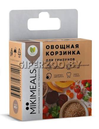 MIKIMEALS Корзинка овощная – это отличное лакомство, состоящее из кусочков овощей, семечек и злаков, которое также подходит для ежедневного потребления. Прочная структура корзинки дает возможность вашему любимцу предаваться вдумчивой грызне, вызывая только положительные эмоции.