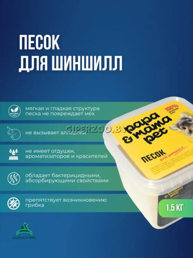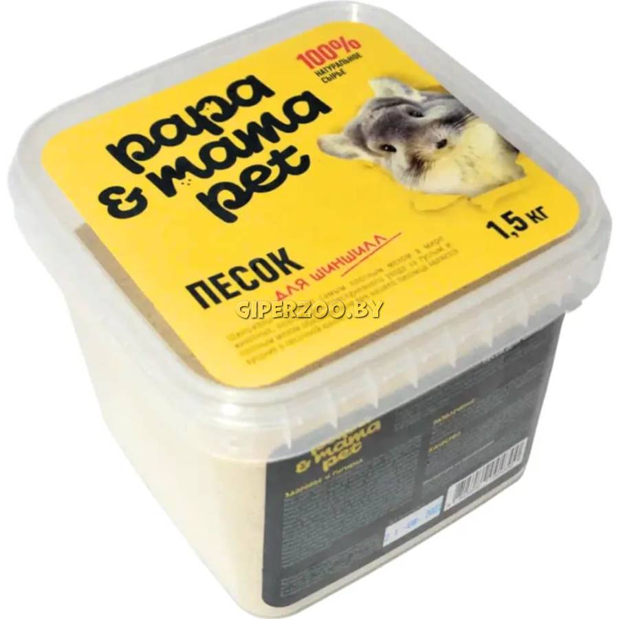 Papa&Mama Pet Песок для купания шиншилл, 1,5 кг – песок для шиншилл (минеральный наполнитель) можно использовать для купания. Данный песок обладает бактерицидными, абсорбирующими и противогрибковыми свойствами, а также имеет мягкую и гладкую структуру, не повреждающую мех. Также купание в песку помогает снять стресс и держать мышцы в тонусе. Песок не имеет отдушек, ароматизаторов и красителей, вызывающих аллергию, угнетение центральной нервной системы и раздражение дыхательных путей.