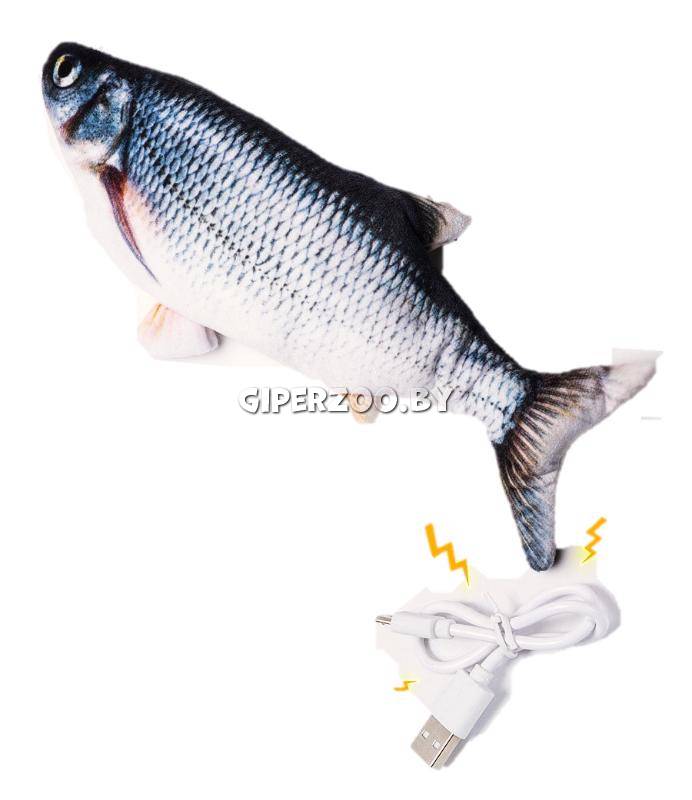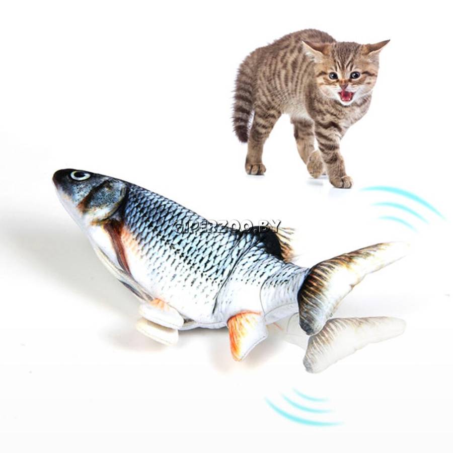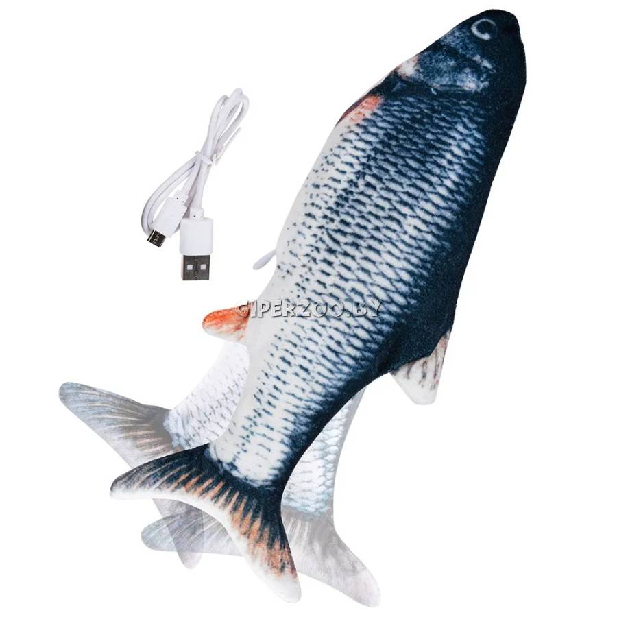 Интерактивная игрушка Fancy Pets Карп с дёргающимся хвостом (артикул 624) — это плюшевая игрушка для кошек длиной 21 см. Внутри неё находится моторчик, который при прикосновении активирует движение хвоста. Игрушка имитирует движения настоящей рыбы, пробуждая охотничий инстинкт у питомца.