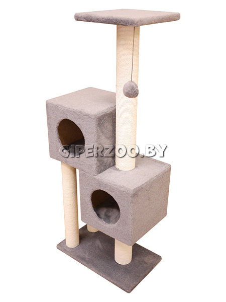 Верхняя часть - площадка, на которой закреплена игрушка-шарик. В распоряжении кота два уютных домика, в которых приятно отдохнуть и расслабиться после активных игр. Все детали покрыты мягким плюшем, столбики обкручены джутом.