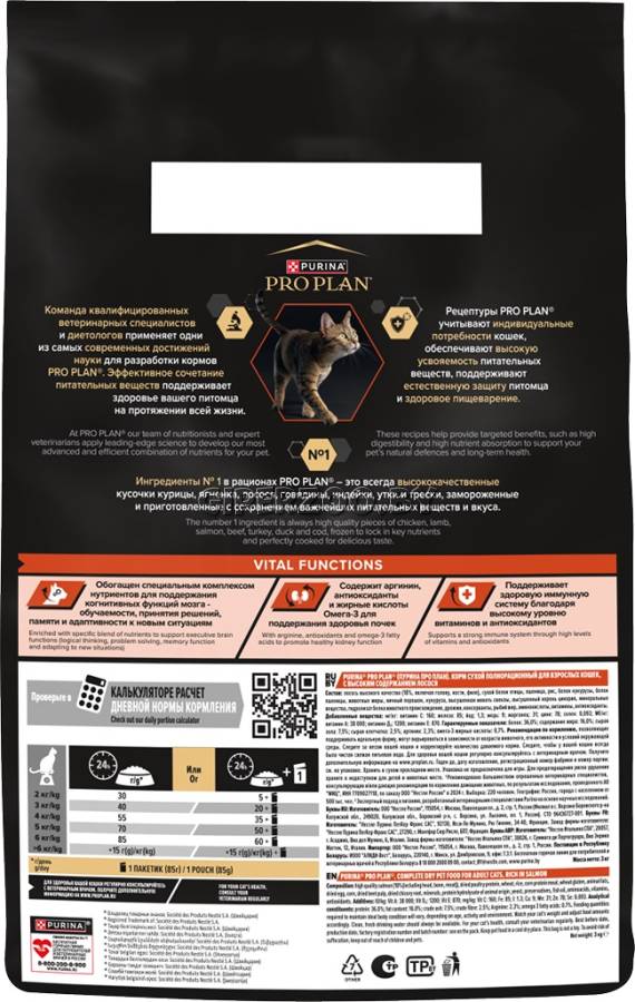 Содержит формулу OPTISENSES - особую комбинацию питательных веществ, таких как аргинин, жирные кислоты омега-3, витамины группы В и антиоксиданты для поддержания органов чувств и защиты когнитивной функции мозга кошек.