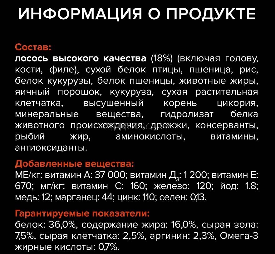 Лосось (18%), сухой белок птицы, пшеница, рис, кукурузный глютен, пшеничный глютен, животный жир, яичный порошок, кукуруза, минеральные вещества, высушенный корень цикория, клетчатка, вкусоароматическая кормовая добавка, дрожжи, консерванты, аминокислоты, рыбий жир, витамины, антиоксиданты.