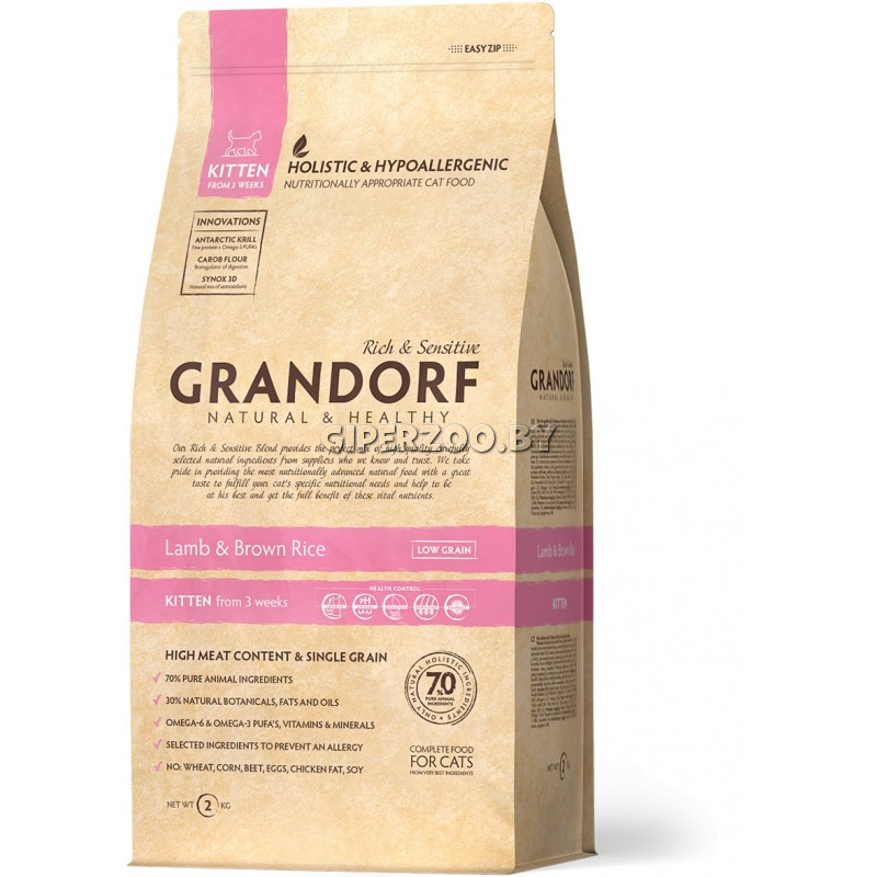 Grandorf Kitten. Сухой корм Grandorf Kitten Низкозерновой корм для котят (ягненок), 0.4 кг - это высокое содержание необходимых протеинов, полезных жиров, аминокислот и витаминов гарантирует оптимальную энергетическую ценность для здорового роста и развития котят. Гипоаллергенная низкозерновая формула для улучшения здоровья и жизненной силы котят. Превосходная гипоаллергенная формула, специально создана для удовлетворения потребностей в питании растущего котёнка и сбалансирована для нежной пищеварительной системы малышей.
