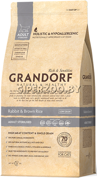 Grandorf Adult Sterilised. Сухой корм Grandorf Adult Sterilised Низкозерновой корм для кошек (кролик), 0,4 кг - это низкозерновой гипоаллергенный рацион для взрослых стерилизованных кошек от 1 года или пожилых кошек. Низкое содержание жиров и повышенное белков, а также L-Карнитин поддерживают оптимальный вес кошки. Тщательно отобранные, натуральные гипоаллергенные ингредиенты, помогают предотвратить аллергические реакции и пищевую непереносимость, а также способствуют поддержанию веса и мышечной массы у стерилизованных и пожилых питомцев в оптимальной форме.