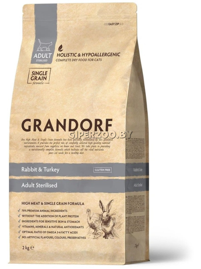 Grandorf Adult Sterilised. Сухой корм Grandorf Adult Sterilised Низкозерновой корм для кошек (кролик и индейка), 2 кг - это низкозерновой гипоаллергенный рацион для взрослых стерилизованных кошек от 1 года или пожилых кошек. Низкое содержание жиров и повышенное белков, а также L-Карнитин поддерживают оптимальный вес кошки. Тщательно отобранные, натуральные гипоаллергенные ингредиенты, помогают предотвратить аллергические реакции и пищевую непереносимость, а также способствуют поддержанию веса и мышечной массы у стерилизованных и пожилых питомцев в оптимальной форме.