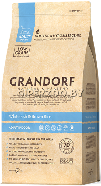 Grandorf Indoor. Сухой корм Grandorf Indoor Низкозерновой корм для кошек (белая рыба), 0,4 кг - корм для кошек от 1 года с проблемной кожей и шерстью или склонных к аллергии. Формула богата мясом океанических рыб, обогащена необходимыми аминокислотами, Омега-3 и Омега- 6 жирными кислотами, которые заботятся о шерсти и коже.