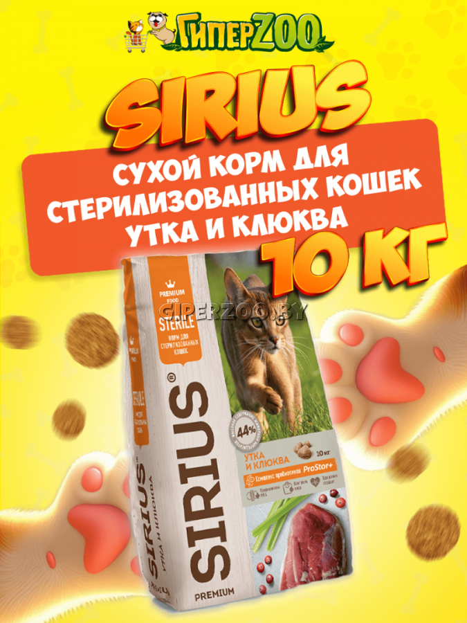 SIRIUS для стерилизованных кошек (Утка, клюква) — сухой корм премиум класса для полноценного ежедневного рациона стерилизованных кошек.