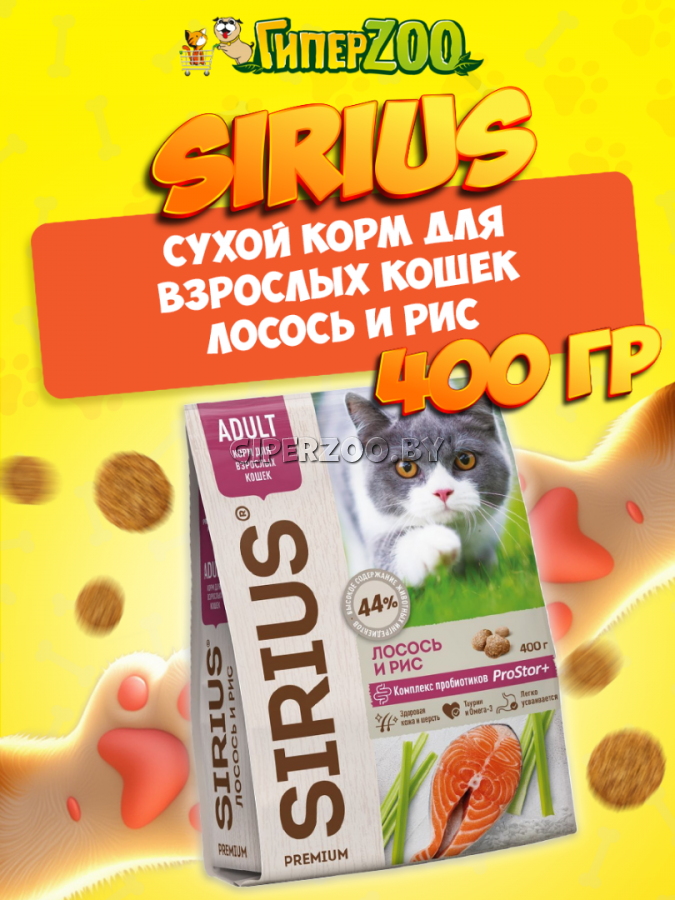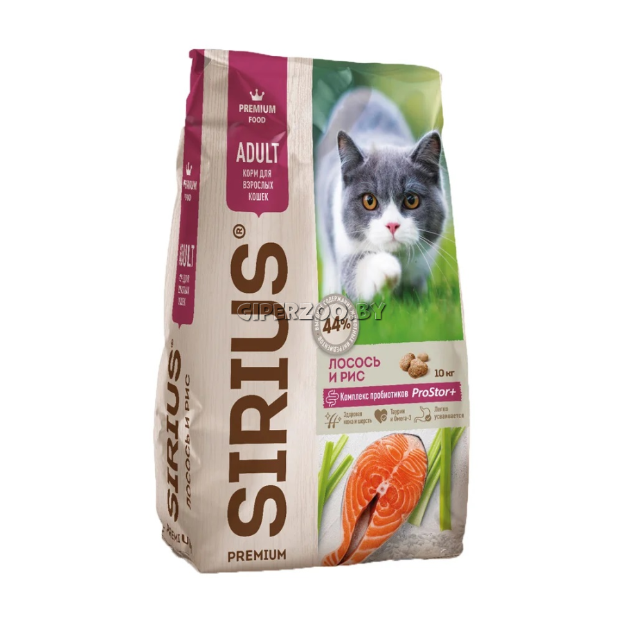 SIRIUS для взрослых кошек (Лосось, рис) — сухой корм премиум класса для полноценного ежедневного рациона взрослых кошек.