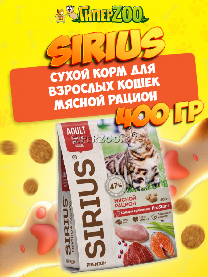 Сухой корм для кошек SIRIUS Adult (мясной рацион), 10 кг - полнорационный сухой корм премиум класса для полноценного ежедневного рациона взрослых кошек.