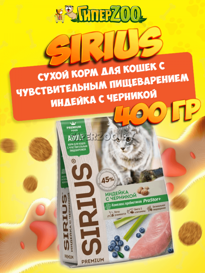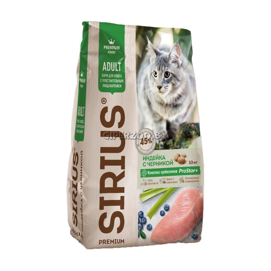 SIRIUS для кошек с чувствительным пищеварением (Индейка, черника) — сухой корм премиум класса для полноценного ежедневного питания взрослых кошек с чувствительным пищеварением.