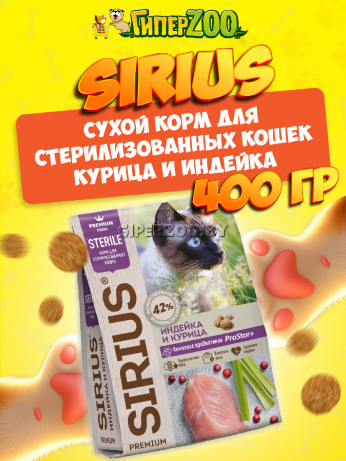 SIRIUS для стерилизованных кошек (индейка, курица) — сухой корм премиум класса для полноценного ежедневного рациона стерилизованных кошек.