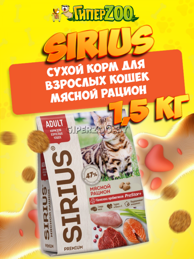 Сухой корм для кошек SIRIUS Adult (мясной рацион), 10 кг - полнорационный сухой корм премиум класса для полноценного ежедневного рациона взрослых кошек.