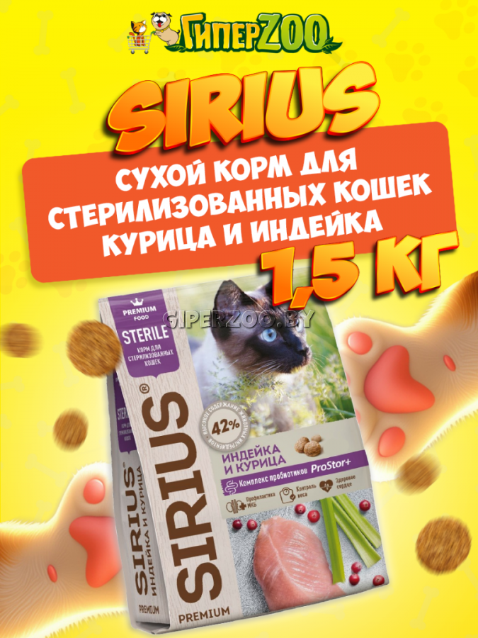 SIRIUS для стерилизованных кошек (индейка, курица) — сухой корм премиум класса для полноценного ежедневного рациона стерилизованных кошек.