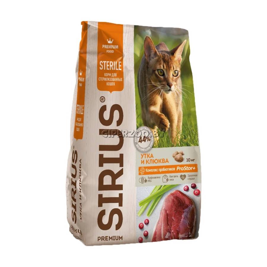 SIRIUS для стерилизованных кошек (Утка, клюква) — сухой корм премиум класса для полноценного ежедневного рациона стерилизованных кошек.