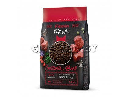 Fitmin For Life Castrate Beef - Полнорационный корм для кастрированных взрослых кошек со свежей говядиной.Новая формула гранул Fitmin For Life для кошек гарантирует высокие вкусовые качества и оптимальное соотношение питательных веществ, представленных в корме.Преимущества:Содержит 84% животного белкаВысокая вкусовая привлекательность – 91% владельцев были удовлетворены реакцией своих кошек на новый корм, который был с энтузиазмом принят лучше или лучше существующего корма. 100% заводчиков порекомендовали бы корм своим друзьям.Свежее мясо – гарантия высокого качества нашей продукции. Это сырье также обеспечивает вкусовые качества корма.Стоматологический комплекс действует на основе антибактериальной защиты полости рта, которая предохраняет зубы от отложения зубного налета и таким образом действует превентивно против образования зубного камня.Говядина относится к наиболее биологически полноценным видам мяса, отличается высоким содержанием незаменимых аминокислот, железа и витамина В2.