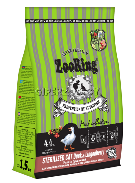 ZooRing Sterilized Cat (утка и брусника), 1,5 кг - полнорационный сухой корм для кастрированных котов и стерилизованных кошек с уткой и брусникой.