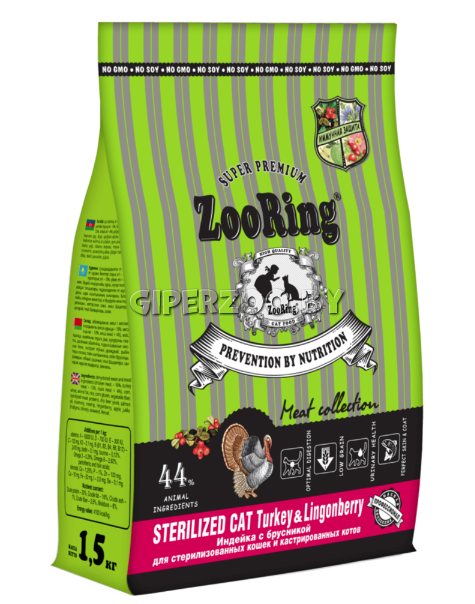 ZooRing Sterilized Cat (индейка, брусника), 1,5 кг -полнорационный сухой корм для кастрированных котов и стерилизованных кошек с индейкой и брусникой.