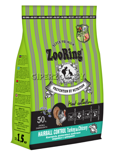 ZooRing Cat Hairball (индейка, цикорий), 1,5 кг - полнорационный сухой корм супер-премиум класс для взрослых кошек всех пород способствующий выведению комочков шерсти из кишечника с индейкой и цикорием.
