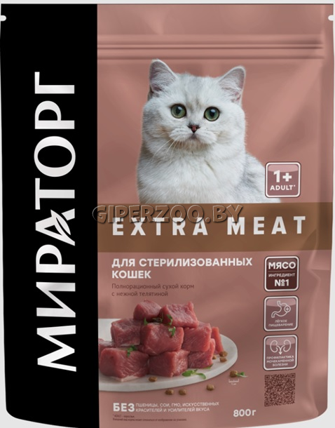 Корм сухой "МИРАТОРГ Extra Meat" для стерилизованных кошек старше 1 года,с нежной телятиной, 0,8 кг Сухой корм Мираторг EXTRA MEAT – корм премиум класса со свежей говядиной и телятиной собственного производства, создан для питомцев, привередливых в выборе питания, а также имеющих чувствительное пищеварение. Диетическая телятина и легко усвояемая говядина дополняют корм полноценным белком животного происхождения для особой пользы и изысканного вкуса. После кастрации и стерилизации риск появления ожирения и избыточной массы тела у кошек значительно возрастает. Специальный корм EXTRA MEAT, в состав которого входит высокоусвояемая телятина обладает особой вкусовой привлекательностью. Рыбий жир, благодаря содержащимся в его составе Омега-3 жирных кислот, улучшает качество шерсти и кожи, а также способствует укреплению иммунитета. Добавление L-карнитина, участвующего в жировом обмене, поможет питомцу сохранять прекрасную физическую форму.