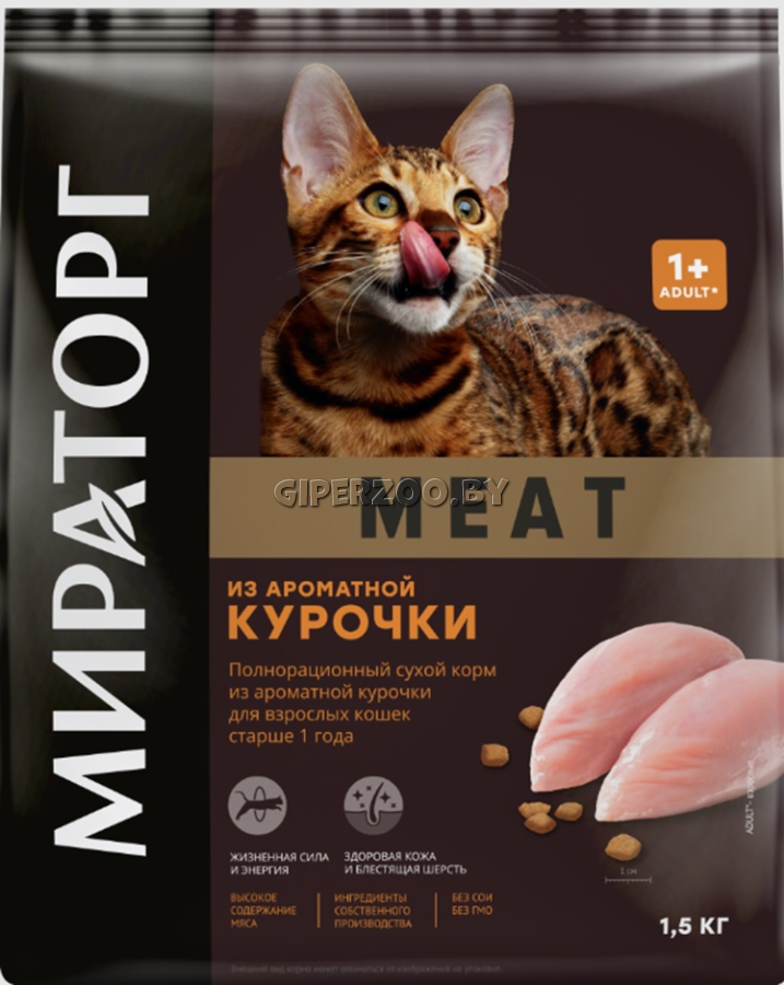 Корм сухой МИРАТОРГ Meat для взрослых кошек старше 1 года, из ароматной курочки, 1,5 кг Сухой корм премиум класса с добавлением свежего мяса порадует питомца новыми вкусами. Высокое содержание мяса курицы, баланс витаминов и минералов, ценные жирные кислоты, а также пребиотики и таурин помогут питомцу оставаться в прекрасной форме долгие годы. Состав продукта: мясо и мясные ингредиенты – 32% (дегидрированное куриное мясо - 28%, свежее куриное мясо - 4%), кукуруза, экстракт растительного белка, пшеница, животный жир, гидролизат белков животного происхождения, рис, минеральные вещества, соль, витамины, дрожжи пивные, высушенная мякоть свеклы, лососевый жир. Содержание питательных веществ в 100 г: Протеин - 36,0% Жир - 11,5% Зола - 7,6% Клетчатка - 1,3% Кальций - 1,3% Фосфор - 1,3% Омега-3 - 0,1% Омега-6 - 2,5% Влага - 9,0% Витамин А -12 000 ME-кг Витамин D3 - 1 200 ME-кг Витамин Е - 150 мг-кг Витамин К3 - 1,14 мг-кг Витамин B1 - 5,0 мг-кг Витамин B2 - 3,4 мг-кг Витамин B3 - 5,3 мг-кг Витамин B4 - 6 426 мг-кг