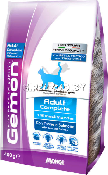 Gemon Cat Adult Complete (лосось и тунец), 20 кг - это полнорационный корм для взрослых кошек с нормальной активностью.