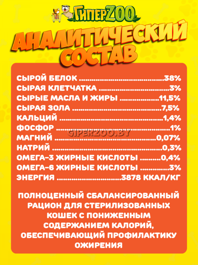 Сырой белок 38%, сырая клетчатка 3%, сырые масла и жиры 11,5%, сырая зола 7,5%, кальций 1,4%, фосфор 1%, магний 0,07%, натрий 0,3%, омега-3 незаменимые жирные кислоты 0,4%, омега-6 незаменимые жирные кислоты 3%.