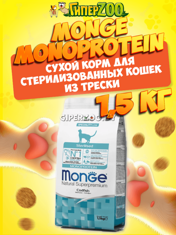 Monge Cat Monoprotein Sterilised Codfish корм для стерилизованных кошек с треской – это полноценный сбалансированный рацион для стерилизованных кошек с пониженным содержанием калорий, обеспечивающий профилактику ожирения.