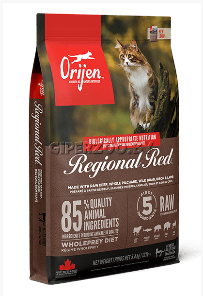 Корм ORIJEN Regional Red, содержащий ингредиенты животного происхождения WholePrey, такие как мясо, рыба, органы и кости, содержит наиболее питательные и сочные части добычи, чтобы обеспечить кошку необходимыми питательными веществами.
