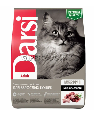 Полнорационный сухой корм для кошек DARSI "Мясное ассорти" для взрослых кошек. Содержит мясной протеин с полноценным аминокислотным составом, а так же Омега-3 и Омега-6 жирные кислоты.