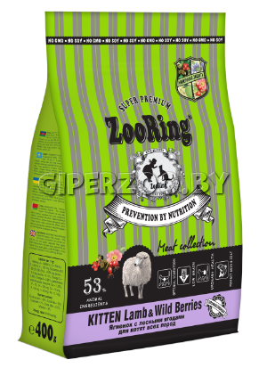 Zooring Kitten (ягненок, лесные ягоды), 400гр - это полнорационный сухой корм супер-премиум класса для котят от 3,5 недель, для беременных и кормящих кошек всех пород.
