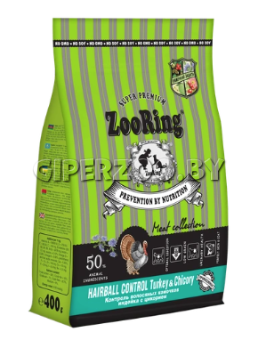 ZooRing Cat Hairball (индейка, цикорий), 400 гр - полнорационный сухой корм супер-премиум класс для взрослых кошек всех пород способствующий выведению комочков шерсти из кишечника с индейкой и цикорием.