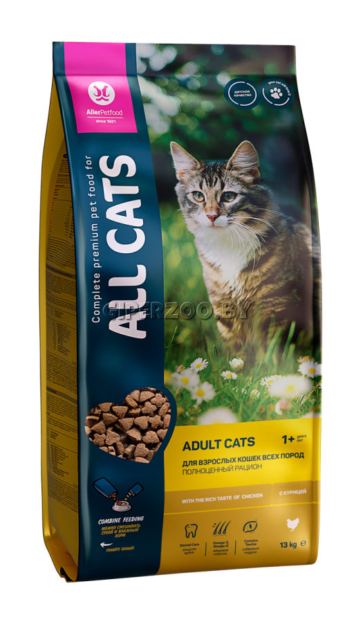 ALL CATS (курица),13 кг – это полнорационный премиальный корм для кошек всех пород. Он разработан на основе результатов последних исследований в области питания домашних животных, а также с учетом международных стандартов (AAFCO/FEDIAF).