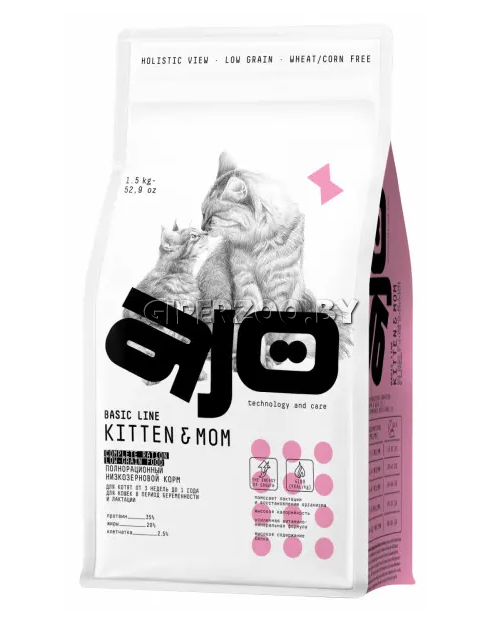 AJO Cat Kitten Mom (индейка), 1,5 кг - полнорационный низкозерновой сухой корм AJO для котят от 3 недель до 1 года, беременных и кормящих кошек с индейкой.
