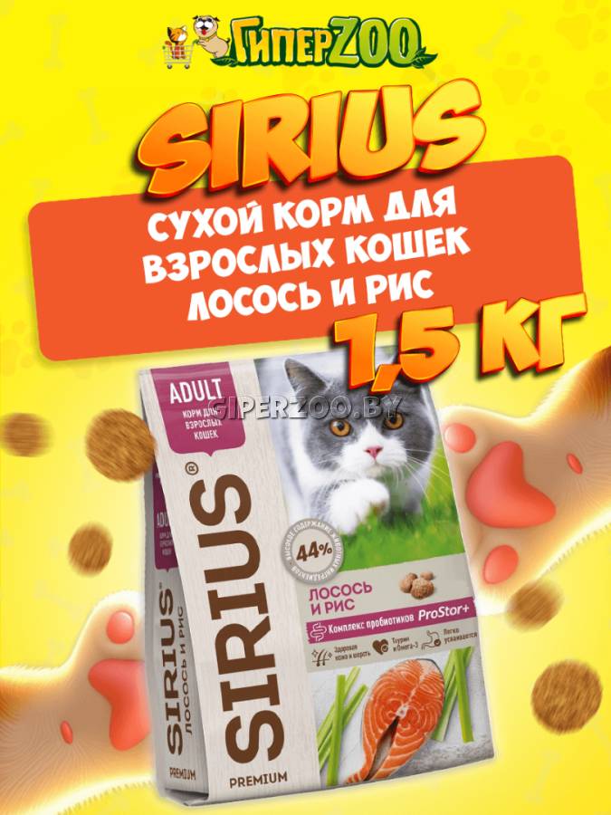 SIRIUS для взрослых кошек (Лосось, рис) — сухой корм премиум класса для полноценного ежедневного рациона взрослых кошек.