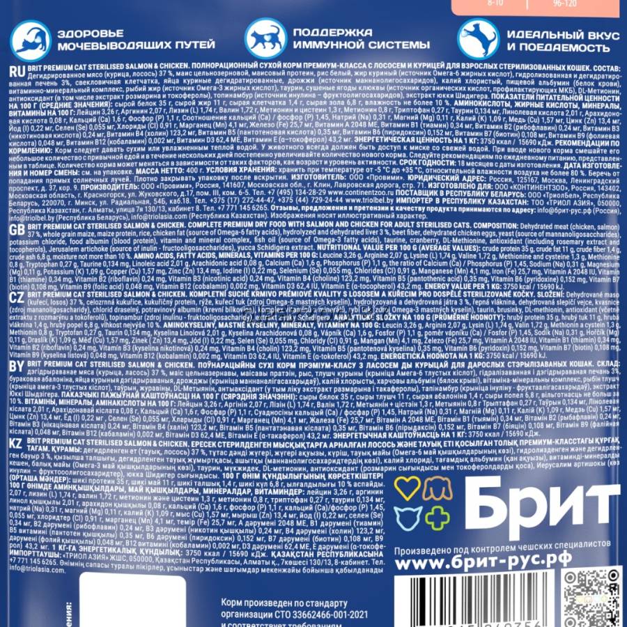 Брит Премиум Сухой корм для взрослых стерилизованных кошек с лососем и курицей Cat Sterilised Salmon&Chicken (Brit Premium) - предназначен для взрослых стерилизованных кошек. Сбалансированный состав содержит все витамины и минералы, необходимые для ежедневного здорового питания вашего питомца. Корм поможет сохранить здоровье и активность вашего питомца, а мясо в составе обеспечивает притягательный аромат и вкус, который не оставит равнодушным даже самых привередливых питомцев.