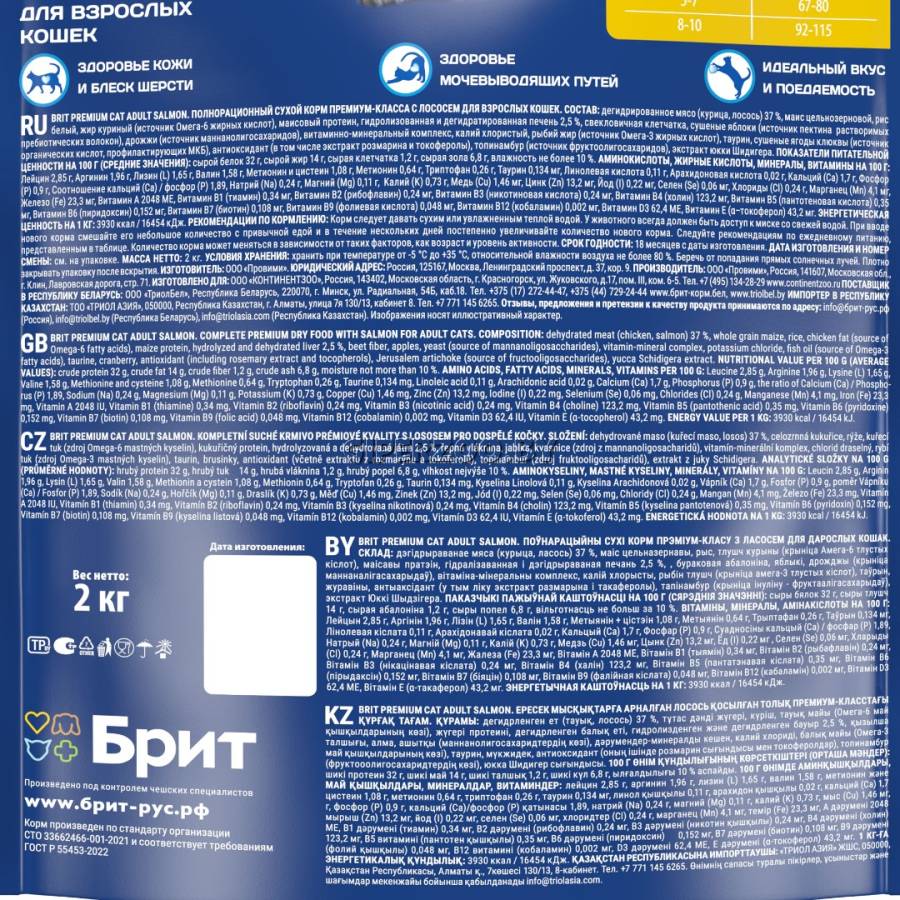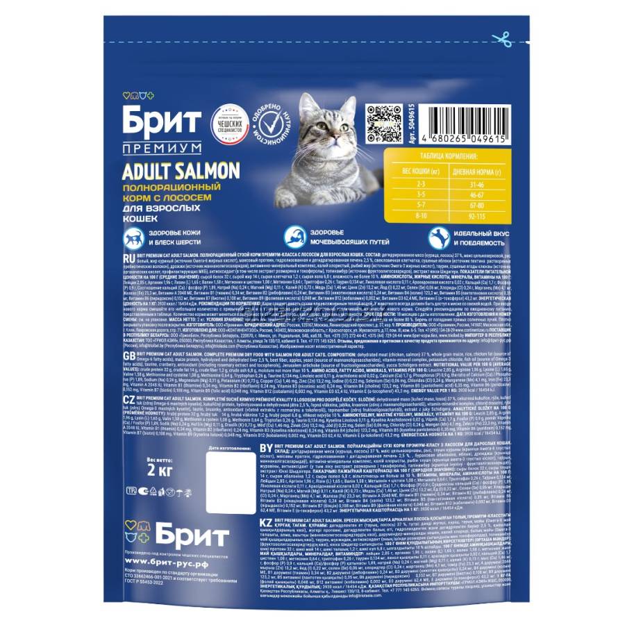 Брит Премиум Сухой корм для взрослых кошек с лососем Cat Adult Salmon (Brit Premium) - предназначен для взрослых кошек всех пород. Сбалансированный состав содержит все витамины и минералы, необходимые для ежедневного здорового питания вашего питомца. Корм поможет сохранить здоровье и активность вашего питомца, а лосось в составе обеспечивает притягательный аромат и вкус, который не оставит равнодушным даже самых привередливых питомцев.