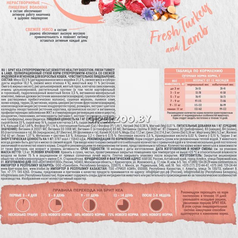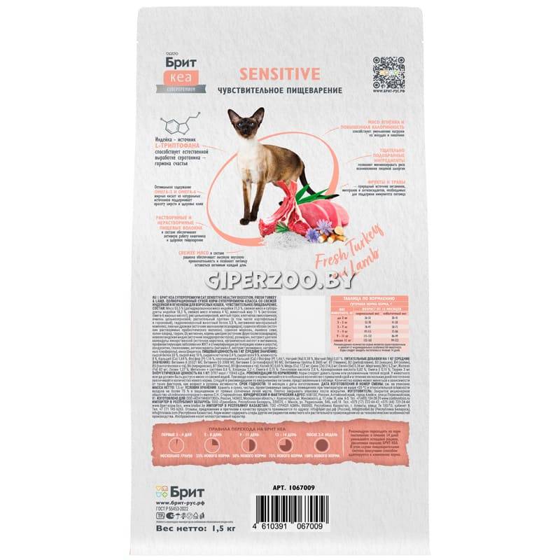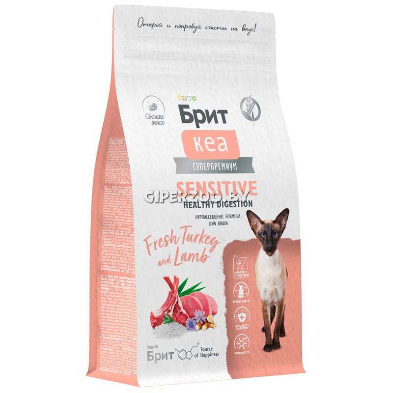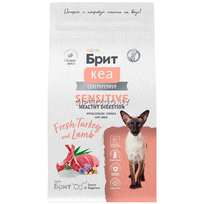 Брит Кеа Cat Sensitive Healthy Digestion (индейка, ягненок), 1,5 кг – полнорационный сухой корм суперпремиум-класса с индейкой и ягненком для взрослых кошек с чувствительным пищеварением.