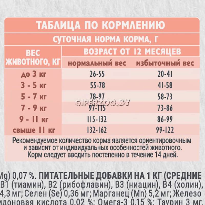 Добавки: питательные добавки на 1 кг: Витамин A 20321 МЕ; Витамин D3 3308 МЕ; Витамин E 85 МЕ; Витамины группы В 2605 мг: В1 (тиамин), В2 (рибофлавин), В3 (ниацин), В4 (холин), В5 (пантотеновая к-та), В6 (пиридоксин), В7 (биотин), В9 (фолиевая к-та); Калий (K) 0,9 %; Медь (Cu) 17,2 мг; Цинк (Zn) 214,3 мг; Селен (Se) 0,4 мг; Марганец (Mn) 5,2 мг; Железо (Fe) 82 мг; Лизин 0,4 %; Метионин + цистеин 0,4 %; Хлориды 1,3 г; Омега-6 0,8 %: Линолевая кислота 0,6 %, Арахидоновая кислота 0,2 %; Омега-3 0,8 %; Таурин 3 мг.