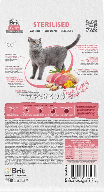Стерилизация часто приводит к снижению физической активности кошек, что может нарушать метаболизм. Brit Care Cat Sterilised Metabolic помогает решить эту проблему благодаря сбалансированному составу, который учитывает особенности организма стерилизованных животных.
